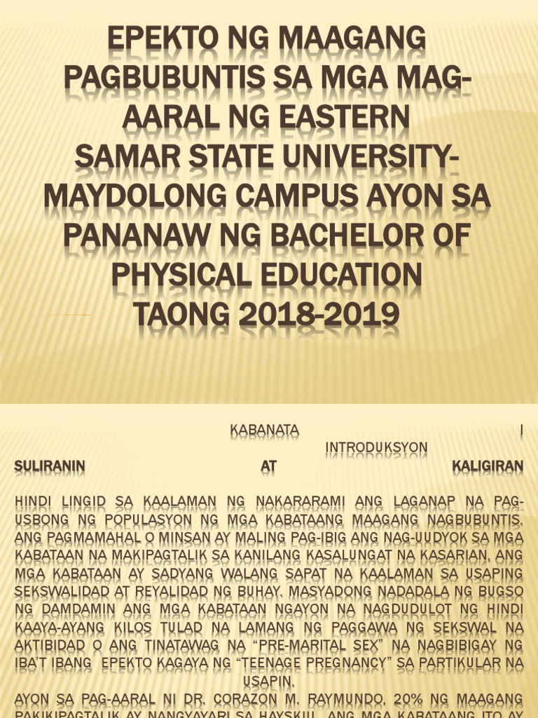 Epekto Ng Maagang Pagbubuntis Sa Mga Mag Aaral Ng Eastern Samar State University Maydolong Campus Ayon Sa Pananaw Ng Bachelor Of Physical Education Taong 2018 2019