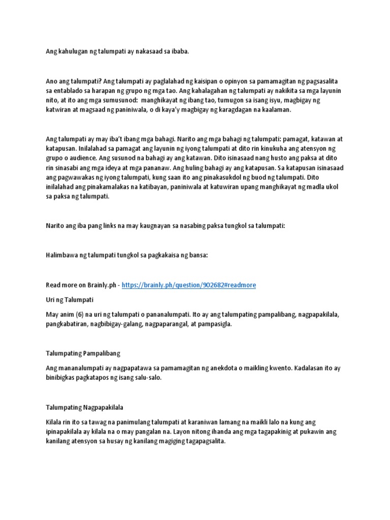 A Layunin b Gamit c Katangian d. Ang talumpati ay isang buod ng kaisipan o opinyon ng isang tao na pinababatid sa pamamagitan ng pagsasalita sa entablado para sa mga pangkat ng mga tao. Katawan - nakasaad dito ang paksang tatalakayin ng mananalumpati.