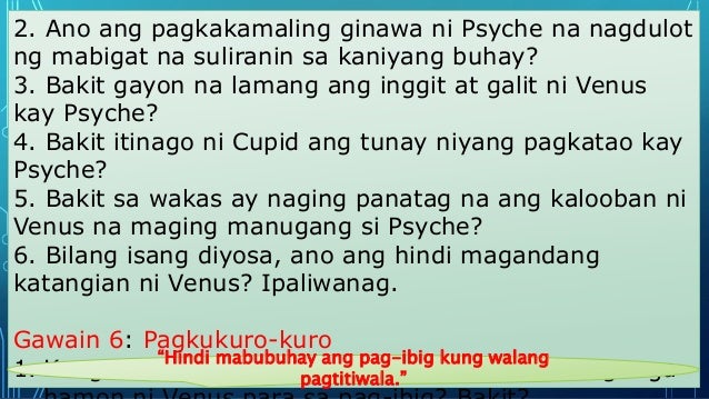 Ang pinakamalaking kaibahan ng mitolohiya sa relihiyon ay ang bilang at dami ng mga diyosdiyosa at pagpapakita ng mga katangiang mortal. Ang ina ni cupid ay nagkaroon ng selos kay psyche dahil sa kanyang kagandahan. 1 question Ano ang layunin ng akda ng cupid at psyche - e-edukasyonph Walang anumang parte ng materyales na ito ang maaaring kopyahin o ilimbag sa anomang paraan nang walang pahintulot sa Kagawaran.