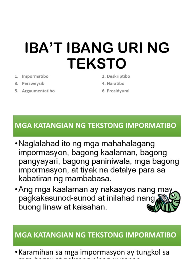 Ang tatlong uri ng tekstong impormatibo ay ang mga sumusunod. MGA URI NG TEKSTONG IMPORMATIBO. Nakahanay ng maayos ang mga salita tiyak ang kahulugan ng mga salitang ginamit ANYO NG TEKSTONG IMPORMATIB ANYO NG TEKSTONG IMPORMATI 1.